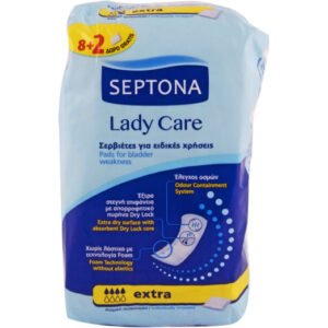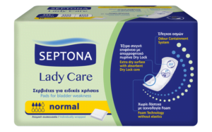 Οι σερβιέτες ειδικών χρήσεων SEPTONA Lady Care, χάρη στον απορροφητικό πυρήνα dry lock, προσφέρουν σιγουριά, προστασία από διαρροές και έξτρα στεγνή επιφάνεια για αίσθηση καθαριότητας. Επιπλέον, το σύστημα odour containment προσφέρει έλεγχο οσμών, ενώ η τεχνολογία foam χωρίς λάστιχα προσφέρει άνεση και ελευθερία κινήσεων. Με υγιεινό κάλυμμα soft touch που δεν ερεθίζει.
